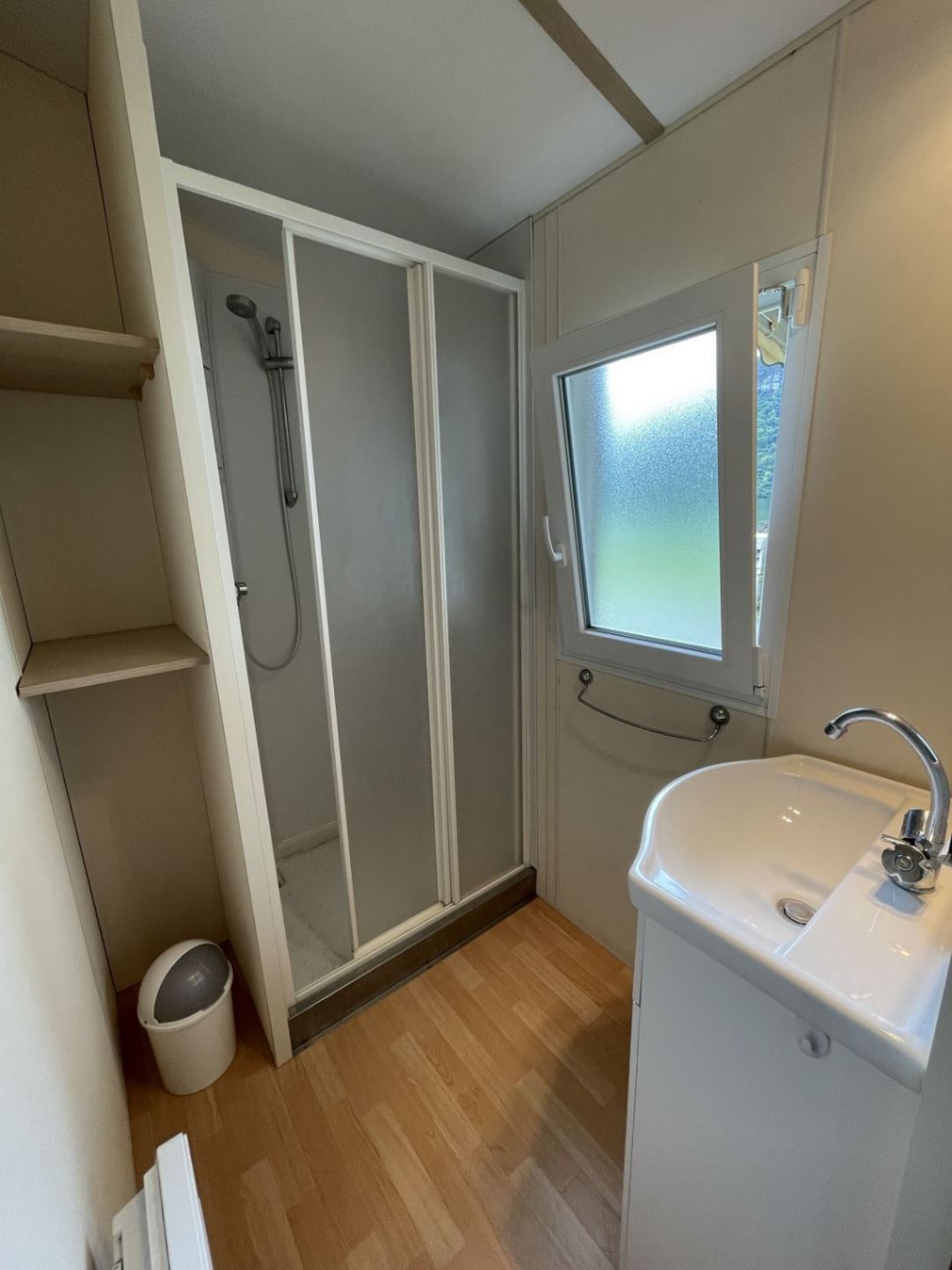 Sanitär: Badezimmer mit Dusche, Waschbecken und separatem WC.