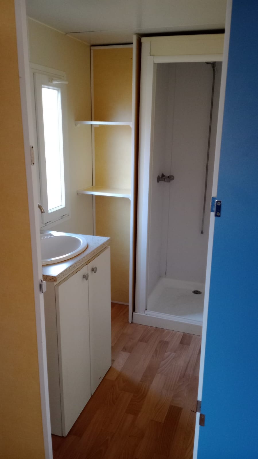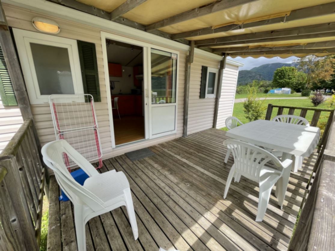 The 4-person Mobil-home CONFORT is a charming option, offering 29 m² of living space with 2 welcoming bedrooms and a 12 m² covered terrace where you can enjoy your meals al fresco thanks to the garden furniture available.